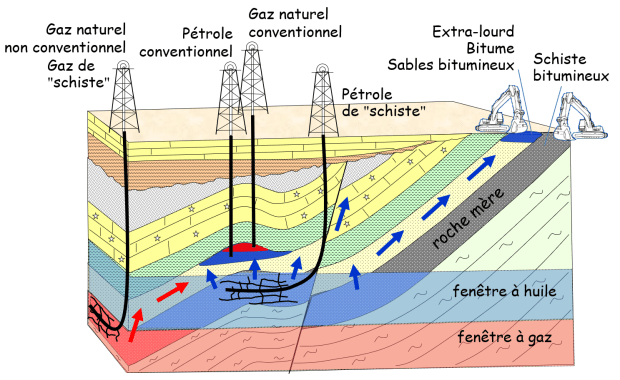 En fonction des propriétés physiques du pétrole (mobile ou immobile) et de la roche (avec ou sans réseau d’interstices), les procédés d’extractions seront très différents (voir Figures 1 et 3). Lorsque pétrole et roche sont tous deux favorables au déplacement du pétrole, on parle de pétrole conventionnel et un simple puit vertical permet déjà une exploitation commerciale. Si le pétrole ou si la roche a des propriétés qui limitent le déplacement du pétrole, on parle de pétrole non conventionnel, et il faut stimuler la roche, la forcer à expulser le pétrole qu’elle contient. Pétrole de schiste et sable bitumineux sont des pétroles non conventionnels. Le pétrole de schiste est très mobile mais la roche-mère le retient car son réseau d’interstices est déficient. On va donc en créer un de toutes pièces, en forant des puits directionnels qui suivent la couche de roche-mère (forage très dévié ou « horizontal ») ; le long de ce forage, à espacements réguliers, de l’eau associée à du sable est injectée sous pression et fracture la roche jusqu’à plusieurs centaines de mètres (fracturation hydraulique), formant un dense réseau de fissures très fines étayées par les grains de sable, qu’emprunte le pétrole pour arriver au puits. Avec les sables bitumineux, on a la situation inverse. La roche a un bon réseau d’interstices, mais le pétrole n’est pas mobile. Une technique utilisée pour obtenir le pétrole, visible à large échelle dans les paysages de l’Alberta au Canada, consiste à extraire la roche imbibée de bitume et à la traiter en usine par eau chaude et vapeur pour séparer bitume et sable. Enfin, avec les schistes bitumineux, aucune propriété n’est favorable ; le pétrole n’existe même pas encore, seulement son précurseur ou protopétrole, le kérogène. Une technique pour en obtenir du pétrole consiste à extraire la roche et à imiter la nature en mode accéléré, c.-à-d. cuire la roche à haute température pour briser les grosses molécules organiques en plus petites, qui sont alors liquides ou gazeuses. On obtient des distillats. Des exploitations ont fonctionné à Autun, Lodève et Créveney en France au début du XXème siècle.