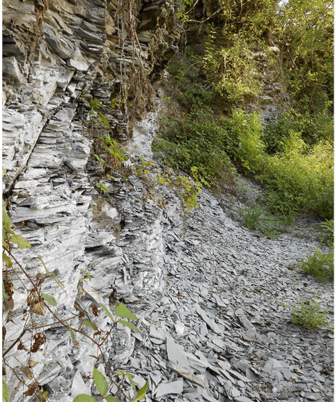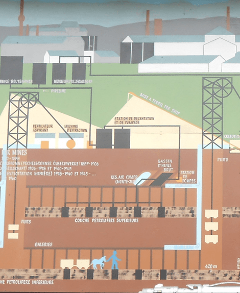 Figure 3 : en haut : exploitation de pétrole conventionnel à Soudron, Marne (2010) ; en bas à gauche : peinture murale illustrant l’exploitation minière de sables bitumineux entre 1740 et 1963 à Merkwiller-Pechelbronn, Bas-Rhin (2017); en bas à droite : front de taille d’une mine à ciel ouvert de schiste bitumineux à Créveney, Haute-Saône (2014). La roche est feuilletée, et grise à cause du kérogène. Par manque de rentabilité, l’exploitation industrielle, effectuée par la Société des Schistes et Pétroles de Franche-Comté, dure moins d’un an, en 1934.