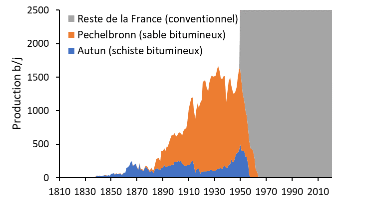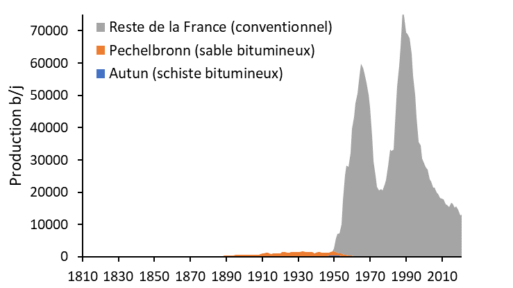 Figure 5 : Evolution de la production pétrolière française. La production a commencé par les pétroles non conventionnels, qui étaient proches de la surface et accessibles via des exploitations minières. A partir des années 1950s, ils sont abandonnés, concurrencés par le pétrole conventionnel du Moyen-Orient qui jaillit sans effort du sous-sol. En France également le pétrole conventionnel commence à être extrait avec des débits qui surpassent rapidement les niveaux historiques des pétroles non conventionnels (échelle modifiée dans la figure du bas).