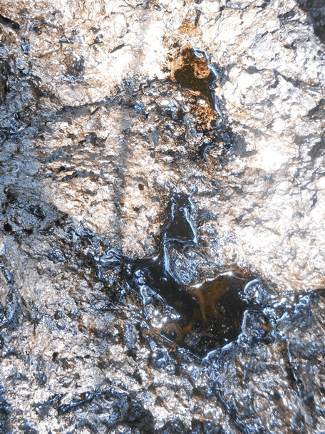 Les hydrocarbures ne restent pas en totalité dans la roche-mère. Une partie est expulsée et migre vers la surface à travers des roches ou failles perméables, car ils sont moins denses que l’eau qui est présente dans les interstices des roches (effet de flottabilité). Lors de cette migration, pétrole et gaz sont parfois arrêtés par un piège géologique : une roche imperméable barrant le passage et sous laquelle une roche poreuse et perméable s’imprègne des hydrocarbures à la manière d’un papier buvard. On obtient un gisement, et les hydrocarbures qu’il renferme sont dits conventionnels, du moins lorsque la roche a maintenu une certaine perméabilité jusqu’à aujourd’hui. Si les hydrocarbures ne sont pas stoppés dans des pièges ou gisements, ils arrivent en surface, forment des suintements (Figure 2) d’où les fractions légères et volatiles s’évaporent, alors que les fractions lourdes et visqueuses peuvent être progressivement altérées par les agents atmosphériques ou digérées par les micro-organismes. Certaines accumulations très importantes donnent lieu à des amas de bitume plus ou moins solide. Parfois, ce ne sont pas les hydrocarbures qui viennent à la surface, mais la surface qui vient à eux, par exemple par érosion des couches géologiques surmontant les gisements. Le résultat est similaire : les fractions légères s’échappent, les plus lourdes et visqueuses restent fixées aux particules minérales, formant des sables bitumineux, des hydrocarbures extra-lourds, des asphaltes.
